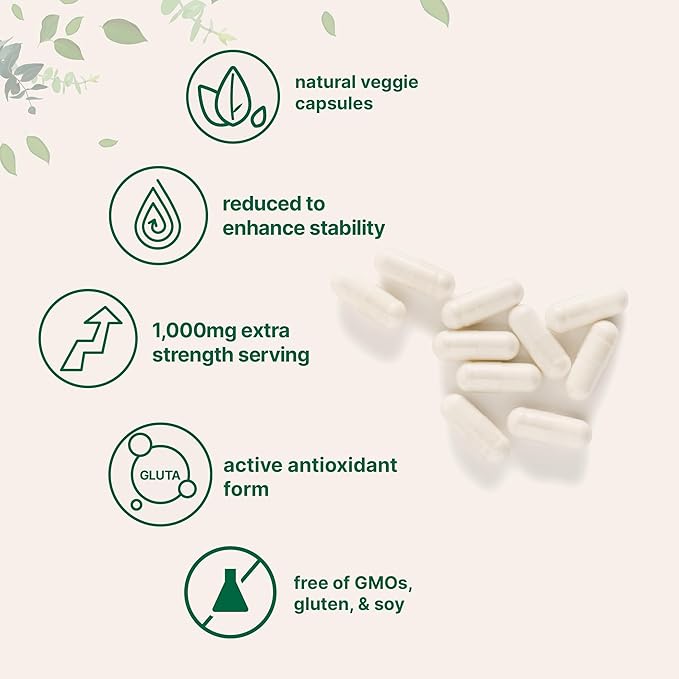 - Each bottle includes 120 natural veggie capsules for a complete 60-day supply. 2 capsules per serving provide 1,000mg of top-grade reduced glutathione for daily balance.
