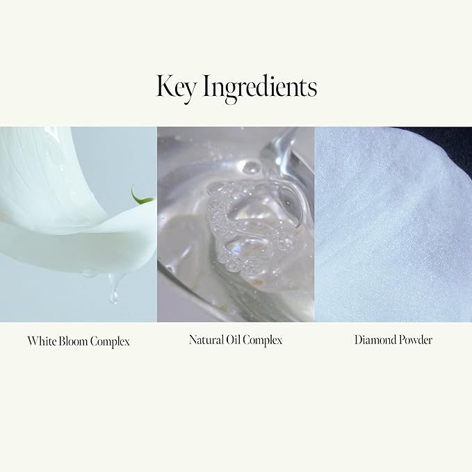 - Creates a Pearl-Like Gloss Layer - Infused with White Bloom Complex and Diamond Powder to form a reflective gloss film that enhances shine, smoothness, and light-catching radiance.