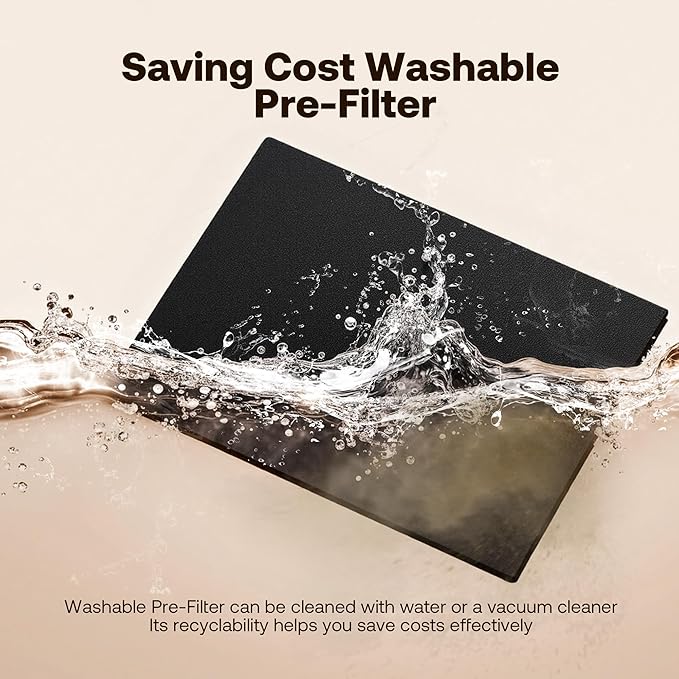 - Washable Filter: Cleaning the pre-filter with water or a vacuum extends the lifespan of the H13 filter, saving filter replacement costs. Our three-stage filter offers powerful filtering. It effectively traps particles like smoke, pollen, pet dander, and hair, with an efficiency of up to 99.97%.