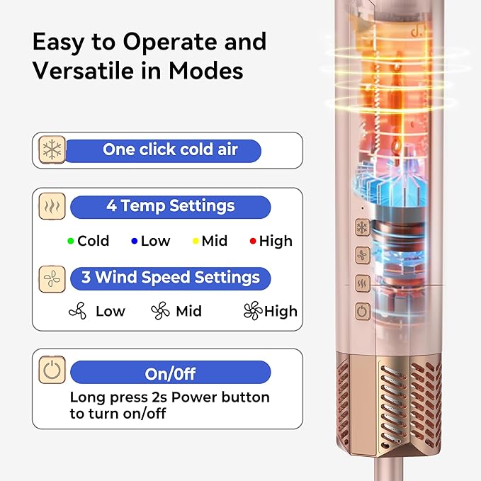 - [4 Temp & 3 Speed Adjustable Air Styler]This 6-in-1 hair brush dryer offers four temperature settings and three airflow speeds, accommodating fine, medium, and coarse hair textures. Adjust airflow and heat flexibly based on your hair's condition, while the one-touch cool shot locks in shine. Press and hold the power button for 2 seconds to turn the device on/off, ensuring safety during styling.