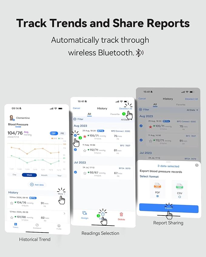 - Bluetooth Connectiviy - Multi-user record management on the ViHealth app; Free to access, review and share records & reports (PDF & CSV) on your iOS or Android, and easy to understand the BP trends