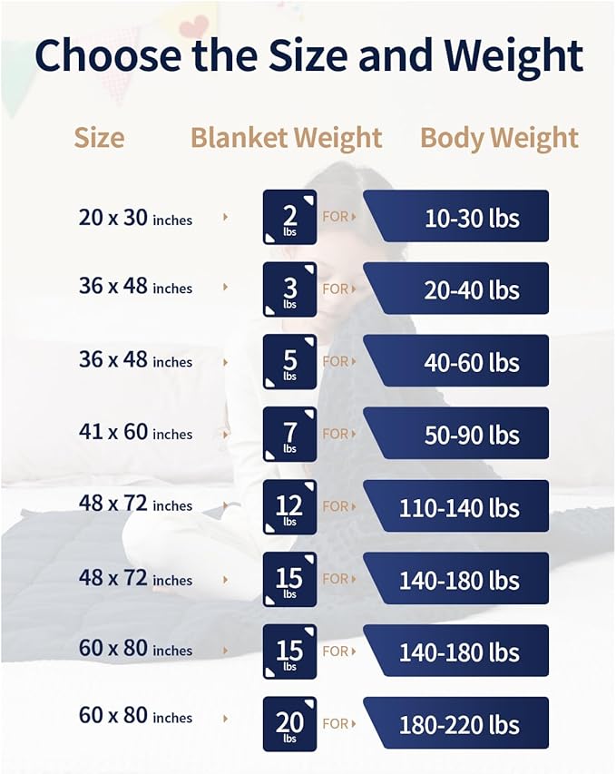 - Choose the Right Size and Weight: We recommend a blanket that is about 10% of body weight. Our carefully selected weights of 2 lbs, 3 lbs, 5 lbs, and 7 lbs are suitable for different age groups of 30-40 lbs, 41-60 lbs, and 61-85 lbs respectively. For taller individuals, a larger 7lbs blanket is recommende