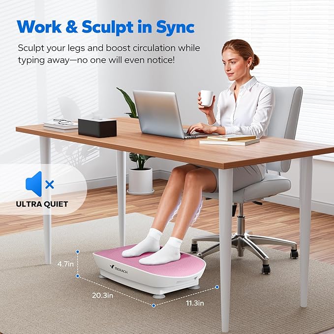 - [Quiet Design, Space-Saving Convenience] Slim vibration plate exercise machine uses noise-reduction technology operates below 40dB (quieter than a whisper). Compact 20.3”x11.3”x 4.7”size fits effortlessly under desks or beside couches. Perfect for home gyms, living rooms, or office breaks—achieve your fitness goals without disturbing others.