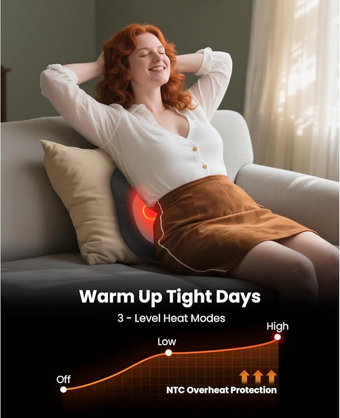 - 2025 Upgraded 3-in-1 Portable Relief Hub: This compact massager delivers on-the-go comfort with 2 heat levels (95°F/35°C low, 104°F/40°C high) and heat-off, ideal as a Shiatsu Back Massager with Heat. Its 35° tilting nodes offer dual-speed kneading that mimics thumb-like pressure, supported by an ergonomic spine cushion. The 10-minute auto shut-off ensures safe use at safe at chair, couch, or bed. A built-in handle makes it perfect for home, office, or travel.