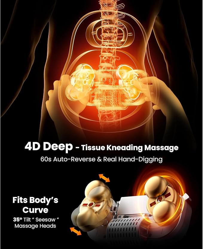 - 4D Pro-Knead Motion: Experience deep, human-like massage at home. Our 35° tilting nodes knead along your back, working out tension that basic massagers often miss—ideal as a neck massager for pain relief deep tissue. The auto-reverse feature smoothly changes direction every minute, keeping the sensation fresh and preventing monotony. Whether you're dealing with stiffness from sitting or just daily stress, it delivers consistent, satisfying relief. Enjoy an adaptable massage that fits easily into your routine.