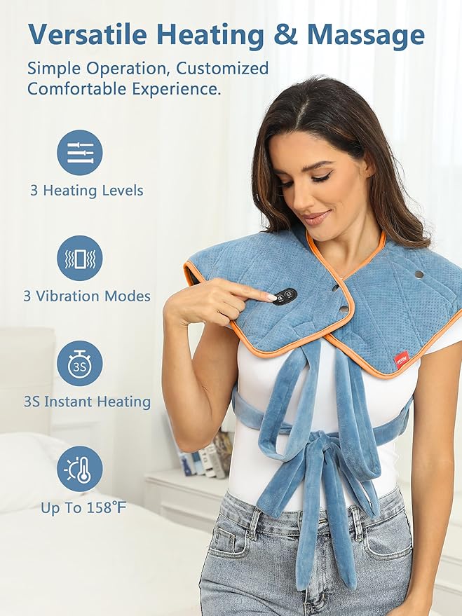 - 3S Instant Heating & 4 Heating Zones:12V large heating pad ,compared with other heating pads, it's designed with 3S instant heating and 4 heating zones to provide ample coverage for your neck, left and right shoulders, and back. The 4 large heating zones strategically target these areas, delivering instantly soothing warmth exactly where you need it most. In addition, it can be flexibly applied to the the waist, abdomen, arms and legs to soothing discomfort