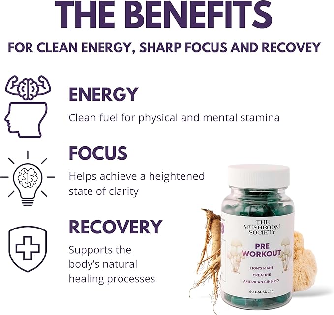 Pre-Workout Supplement - Focus & Performance Stack with Lion’s Mane, Creatine, American Ginseng & Beta-Glucans – Natural Energy & Endurance Without Caffeine - 120 Vegan Capsules