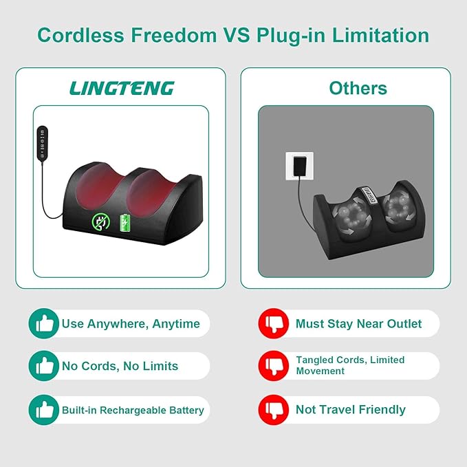 - Easy to Use & Move: Cordless foot massager comes with a cord control (1.3 m / 51 in), no need to be tied down in one place like traditional foot massagers, no need to bend over to touch the controls to turn the product on and off, perfect for travel or office use without cords
