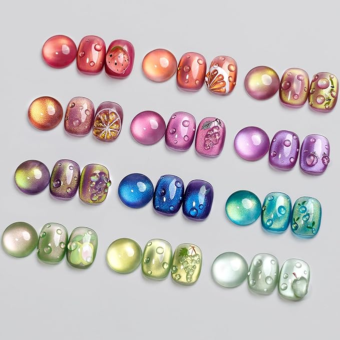 - 3D Fruit Cat Eye Manicure: This 12-color cat eye gel can be used with 3d gel to create different fruit cat eye effects, and you can also use this cateye gel to DIY various shapes for a unique manicure experience.