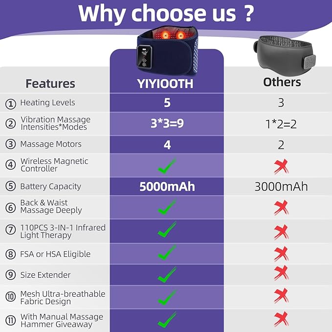 - 【5000mAh Long Battery + Newest Upgrade Magnetic Controller】The back heating pad massager belt is equipped with a 5000mAh long-lasting battery, which is more durable than the common 2000mAh -3000mAh on the market. The back massager belt is uniquely designed with the latest magnetic controller, which is connected to the massager belt through five points of magnetic attraction, adding convenience. The overall LED touch screen ensures clarity and enhances the sense of technology