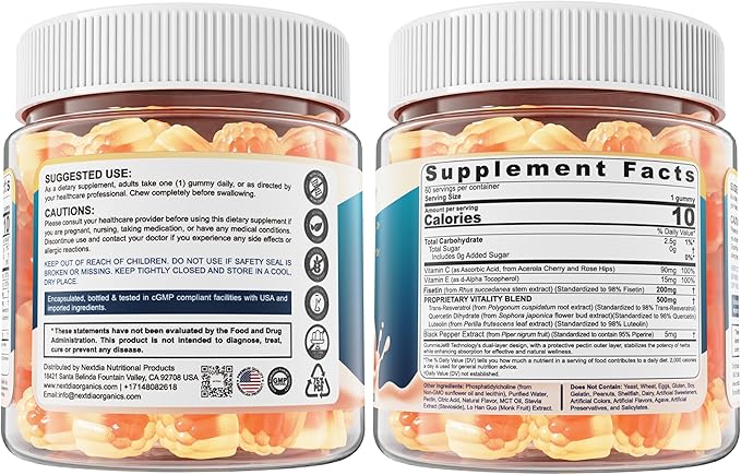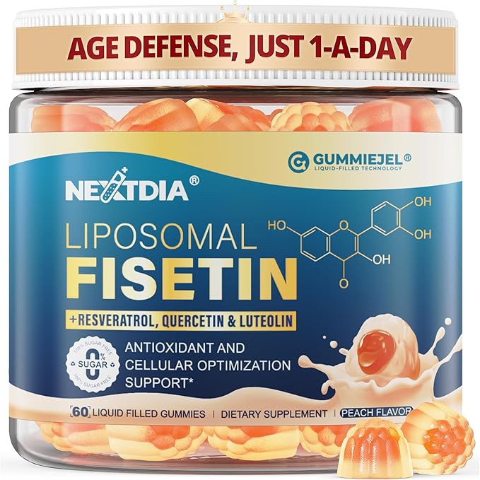 - CONVENIENT, CLEAN & TRUSTED FORMULA - Experience the power of fisetin in our easy-to-take, 1-a-day liquid-filled gummy. The formula is sugar-free, non-GMO, vegan, and gluten-free, with no soy, gelatin, or artificial additives. Infused with a delicious peach flavor, it’s an easy and enjoyable way to enhance your daily routine. Produced in cGMP-certified facilities and third-party tested, our sugar free fisetin gummies ensure consistent quality, delivering optimal health and longevity benefits.