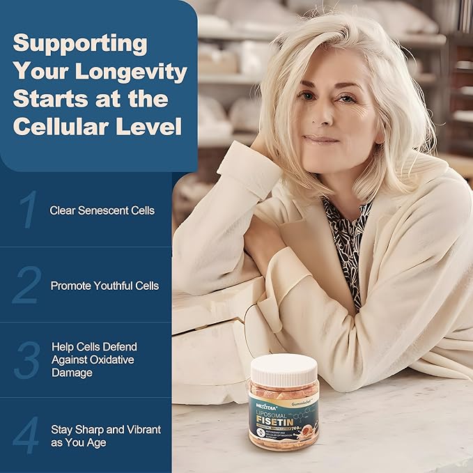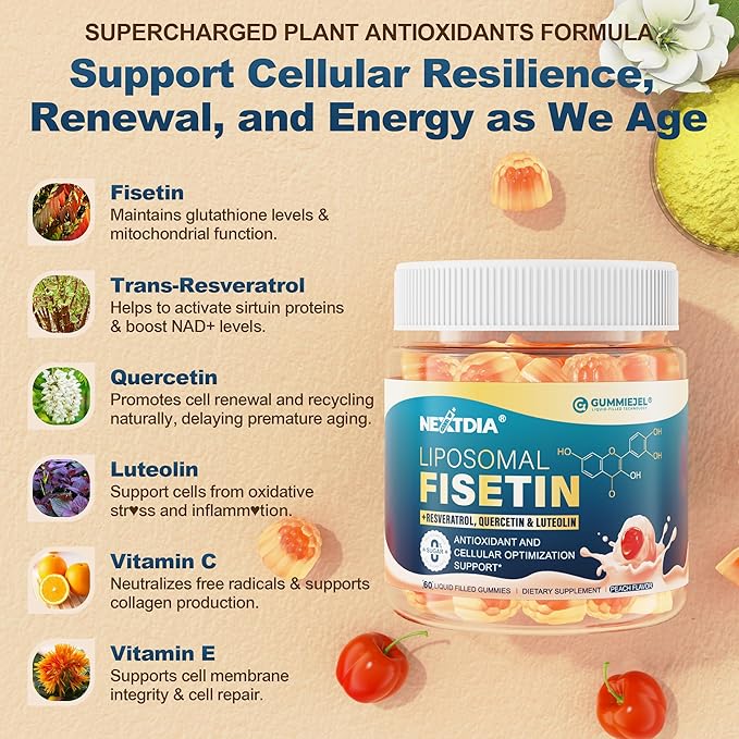 - THE CELLULAR REJUVENATION POWERHOUSE -- Fisetin, a powerful bioflavonoid polyphenol, acts as a "hero" for cellular health by targeting and clearing aging cells, allowing space for healthy tissue regeneration. By boosting glutathione levels and supporting mitochondrial function, our liposomal fisetin supplement enhances cellular repair and daily vitality. Each gummy delivers 200mg of 98% pure fisetin—a science-backed dose for cellular rejuvenation and vitality.