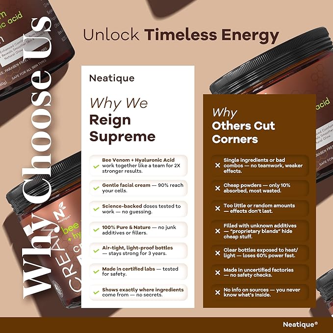 - Natural Bee Venom & Hyaluronic Acid Fusion:Harnessing the power of 100% natural bee venom and hyaluronic acid, this anti-aging cream stimulates collagen synthesis and deeply hydrates to visibly reduce wrinkles, fine lines, and sagging skin. Experience skin tightening and a radiant, youthful glow with every use