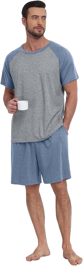 Mens Pajama Set Summer Pjs Sleepwear Lightweight Short Sleeve Pjs Soft Comfy Sleep Set With Pocket
