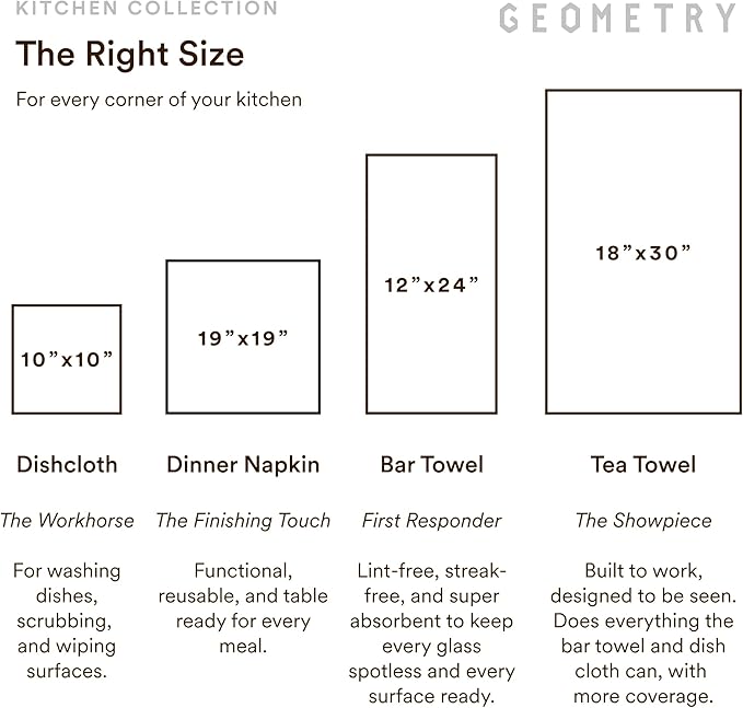 - SUPER ABSORBENT & QUICK-DRYING: The absorbency of our premium microfiber is hard to beat, absorbing nearly 7X its weight in liquid. An ordinary wet towel can quickly become smelly with this amount of liquid, but Geometry's kitchen tea towels are designed to dry faster which means more time between washes and an overall fresher kitchen towel experience.