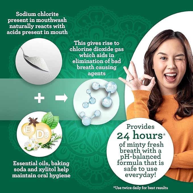 - DUAL-ACTION FRESHNESS: GuruNanda Breath Harmonizer Oral Rinse Mouthwash features a fluoride-free, dual-chamber formula combining sodium chlorite & essential oils that helps eliminate unpleasant odors, providing 24 hours of fresh breath when used twice daily.