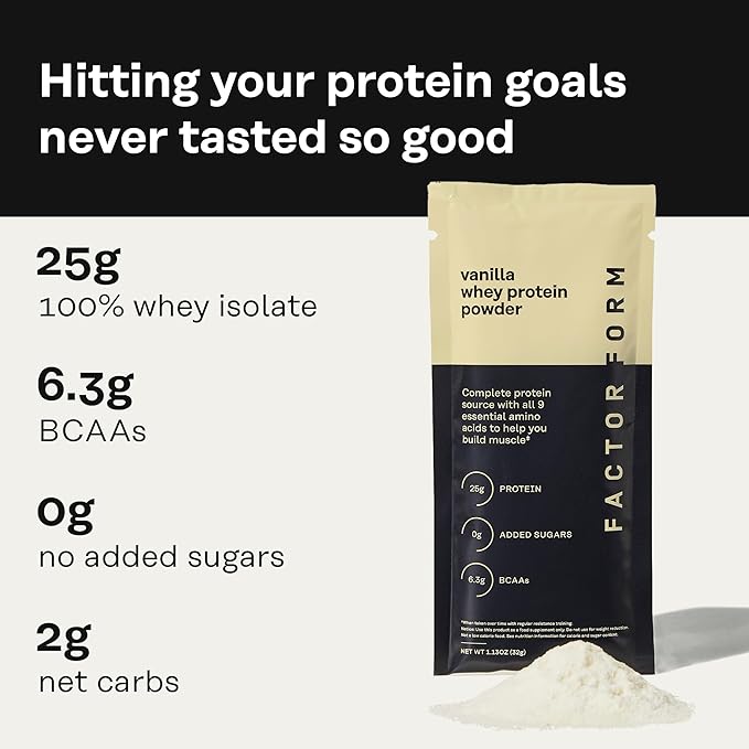 FACTOR FORM Whey Protein Powder | 100% Whey Isolate | 25g Protein & 6.3g BCAAs | Low Carb & Keto-Friendly | No Added Sugar (15 Packets, Vanilla)