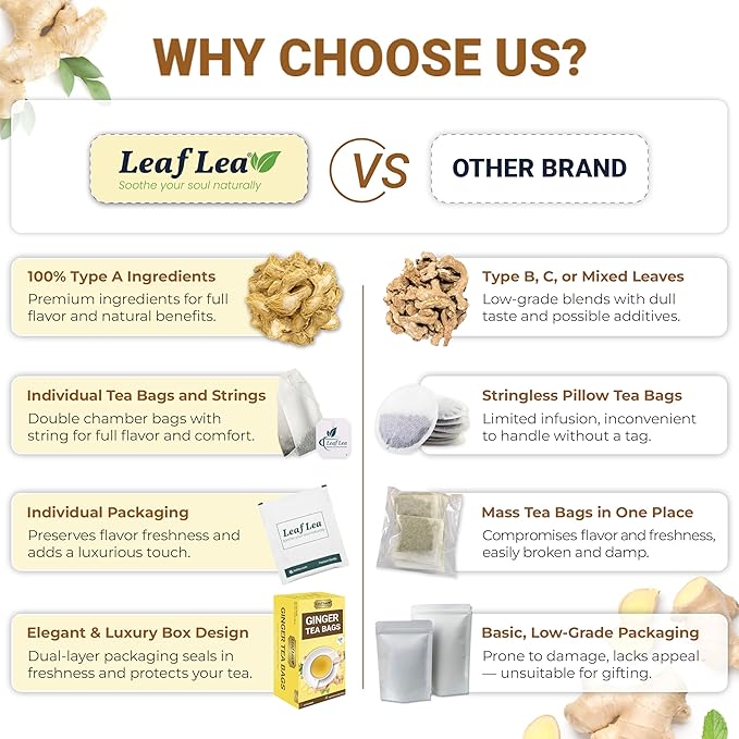 LeafLea 100% Pure Ginger Root Tea Bags – Spicy & Warming Herbal Tea, Supports Digestion & Immune Health, Individually Wrapped, Non-GMO, Caffeine Free, Sugar Free, No Gluten