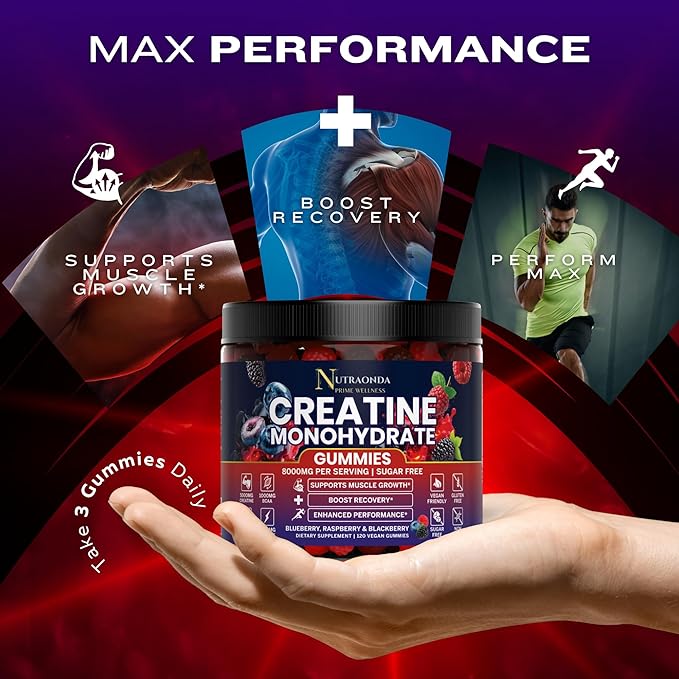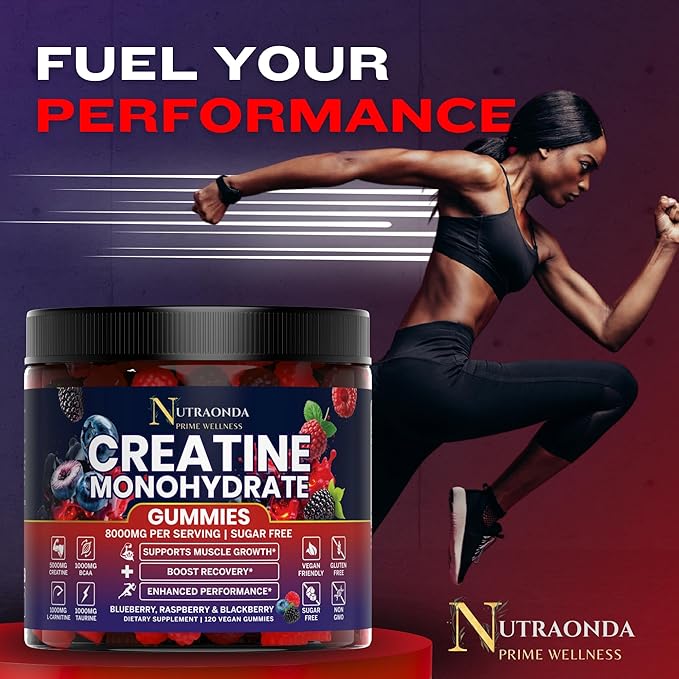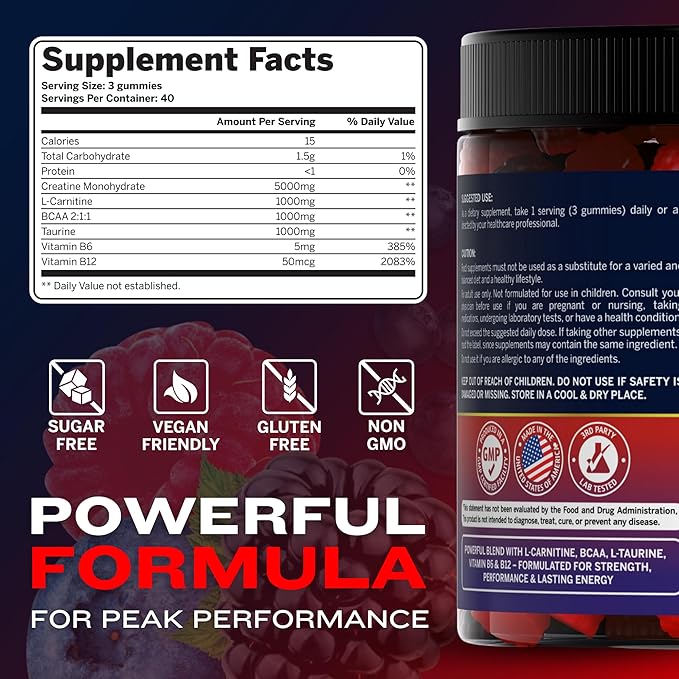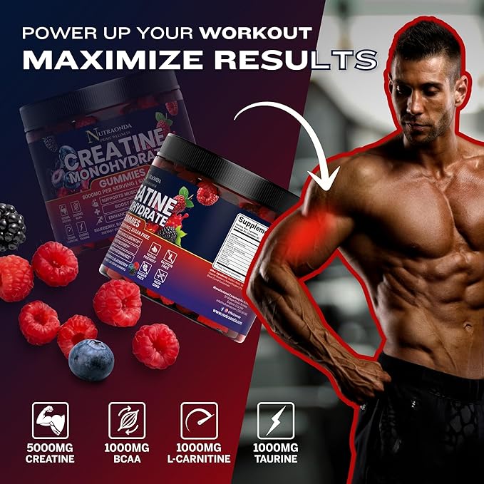 - Advanced Creatine Complex: The Nutraonda energy gummies for women and men feature a powerful nutrient complex, combining the benefits of 5000mg creatine, 1000mg BCCA, 1000mg l-carnitine and 1000mg taurine per serving that deliver unmatched endurance and maximum pump.