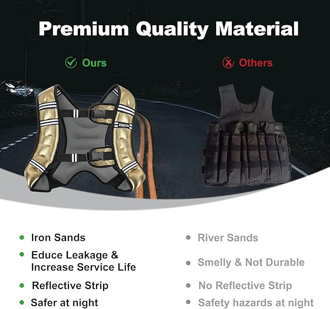 - Adjustable Straps & Reflective Stripes: Each weighted vest has adjustable straps to prevent slipping or sliding, ensuring a better fit for users of all chest sizes and improving exercise efficiency. The reflective strips on both sides of the weighted vest reflect vehicle headlights for safer night running, keeping you away from traffic accidents in any weather conditions (rain, fog, darkness), day or night