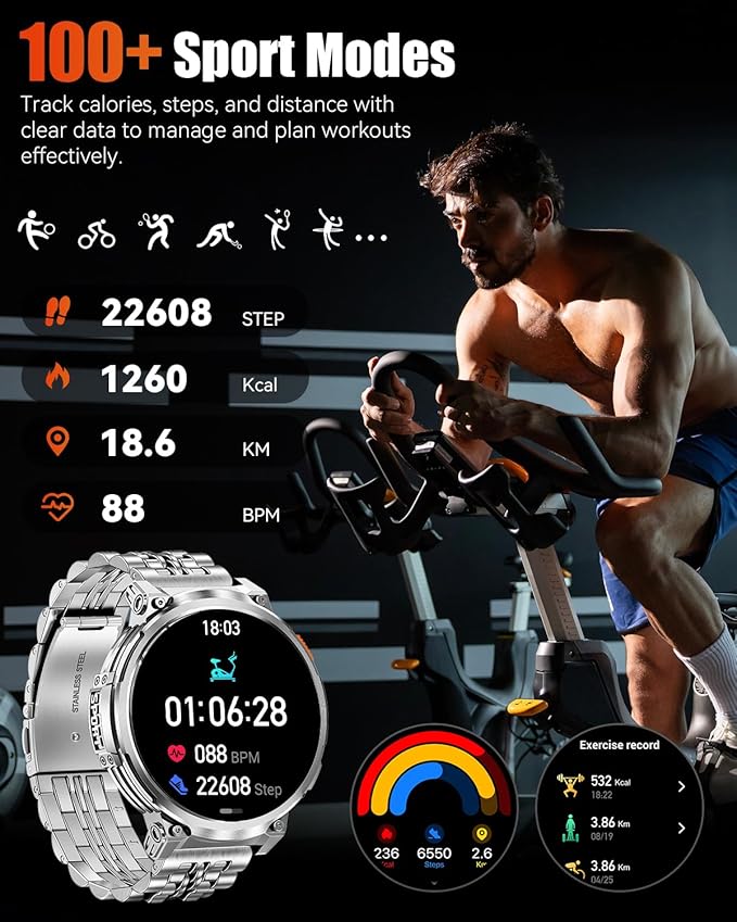 - 【Military-Grade Durability & IP68 Waterproof】Built for tough environments, this smartwatch features a military-grade composite and metal case, passing impact, temperature, and more tests. The high-strength tempered glass screen resists damage during activities. With IP68 waterproofing, it’s resistant to water, dust, and sweat, ensuring reliable performance in rain, handwashing, or daily activities. Please note, it is suitable for everyday water exposure like rain or handwashing, but swimming is not recommended.