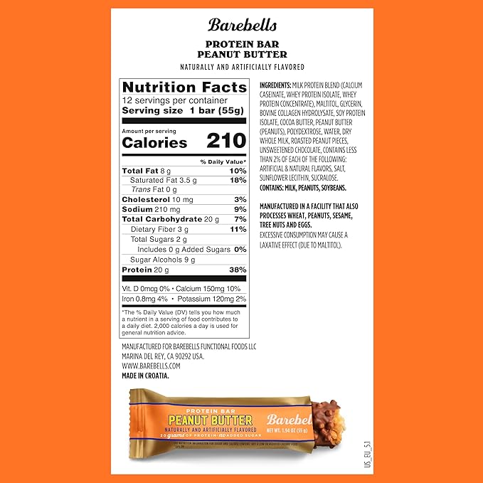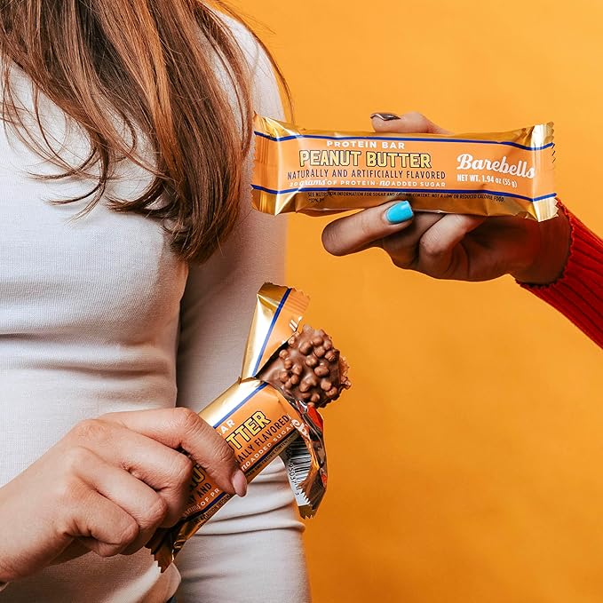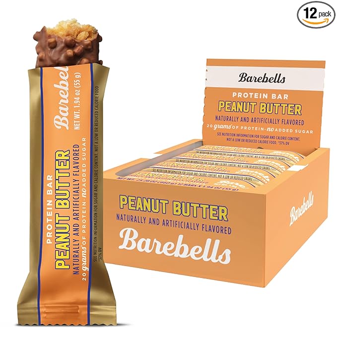 - BAREBELLS PEANUT BUTTER PROTEIN BAR - 12 individual yummy Barebells protein bars! Barebells Peanut Butter features a soft, peanut butter-flavored nougat with crunchy peanut pieces, layered with smooth peanut butter, topped with crispy rice bits, all coated in milk chocolate.