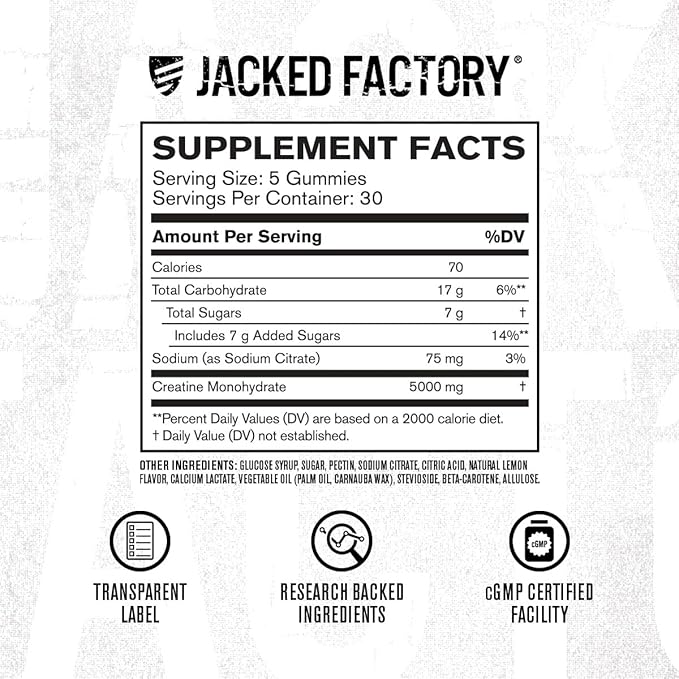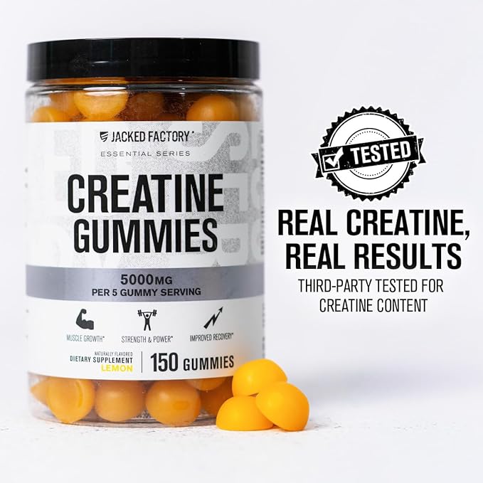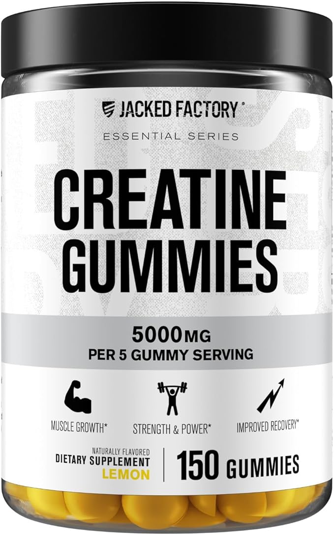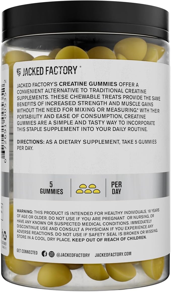 - Creatine Gummies for Active Men and Women: Designed for athletes, bodybuilders, fitness enthusiasts, and anyone looking to improve performance in the gym or on the field, Jacked Factory Creatine Monohydrate Gummies deliver 5,000 mg of pure creatine monohydrate in just 5 tasty, easy-to-chew gummies. Perfect for busy lifestyles, these convenient gummies can be used as a daily muscle-building supplement, making it easy to take your creatine anytime, anywhere - no shaker bottle required.