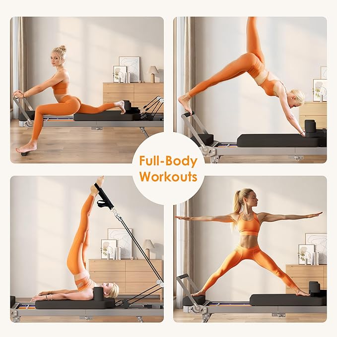 - Smooth Gliding & Ergonomic Comfort: Featuring aluminum sliding rails for a smooth glide for superior comfort, this Pilates machine ensures a comfortable and satisfying workout experience every time.This versatile Pilates machine targets multiple muscle groups, including arms, back, chest, abdomen, hips, and thighs, helping you achieve a lean, toned, and shapely body. Improve your posture and enhance your fitness with a variety of targeted movements.