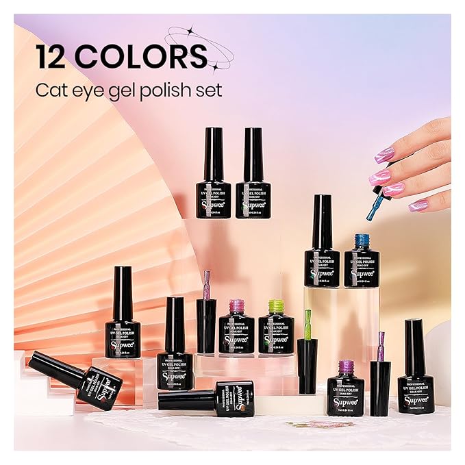 - 12 Vibrant Colors & Magnetic Tool: Includes 12 stunning Cat Eye Gel Polishes and 1 magnet for creating mesmerizing cat eye effects in various shapes