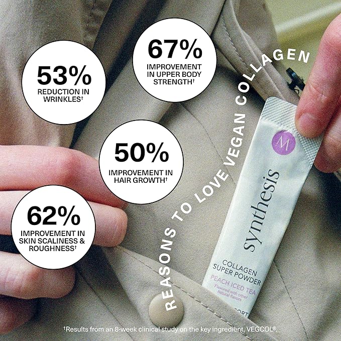 Synthesis Vegan Collagen Peptide Powder - Vegetarian Plant Based Collagen for Skin, Hair, Nails, Anti Aging, Muscles, Gut Health - Hyaluronic Acid, Biotin, Vitamin C, Antioxidants - 30 Stick Packs
