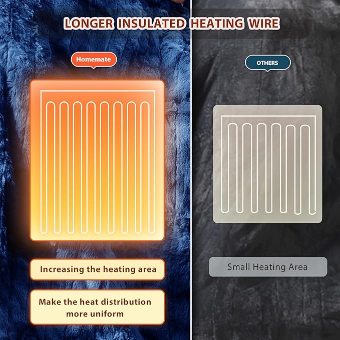 - Safety: Homemate heated blankets have passed the American safety UL964 Test. Have ETL Certification.Lower Electro Magnetic Radiation.The heating wire is designed and produced by Japanese company,more advanced technology,stronger insulation and flame resistance.Moreover,the heating blanket use NTC overheating protection technology to ensure that it will not overheat and cause burning. And our heating wire is longer, so the heating area is larger and the heat is more evenly distributed