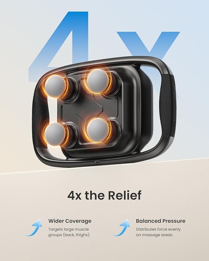 - Four-Headed Efficiency: This percussion massage gun delivers faster recovery to large muscle groups. It uses simultaneous multi-point relief to cover a larger area, reducing recovery time significantly