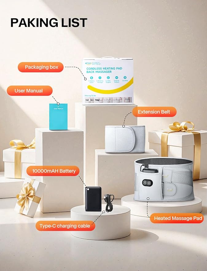 - 【10000mAh BATTERY CORDLESS & PORTABLE】ALLJOY portable heating pad is 10000mAh battery operated (included). It's not to be tied down to a power cord anymore. Use it freely when doing housework, driving a car, or working on the computer. This heating belt runs for 5 hours on a single charge when both heating and vibration sets to the lowest settings simultaneously.