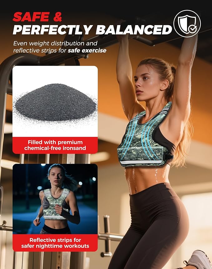 - Breathable & Comfortable: Made with premium neoprene & soft iron sand fill, this weighted vest for men and women ensures even weight distribution and a secure fit during high-intensity workouts. The extra-wide padded shoulder straps reduce pressure, while elastic bands provide full mobility without restriction