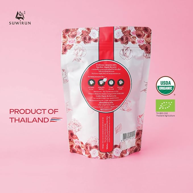Suwirun Organic Rose Tea 25 Bags โ 100% Pure Rose Petals โ Delicate Floral Aroma, Naturally Caffeine-Free โ Relaxing Herbal Tea, Enjoy Hot or Cold