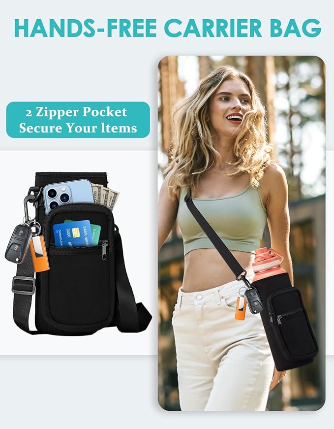 - HANDS-FREE BOTTLE CARRIER BAG & PROTECTIVE BOOT - Stainless steel water bottles with shoulder strap carrier have 2 zipper storage pockets hold your phone, cards, keys. The carrying pouch also provide extra insulation, with the silicone cup mat full-protect the reusable water bottle from additional damage and extend the life of thermo hydro mug
