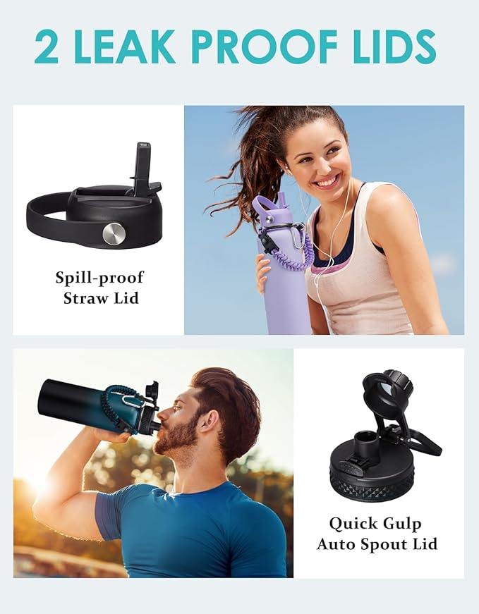 - LEAK-PROOF 2 LIDS - AUTO SPOUT LID & STRAW LID meet you different drinking need, and both lids are leak proof and with handle for carrying on the go. The pop-up spout lid features a button for one hand open quickly, and a large water outlet for fast drinking. The straw lid with straw lets you enjoy spill-proof sipping to all your outdoor adventures, also can prevent the inhalation of ice cubes