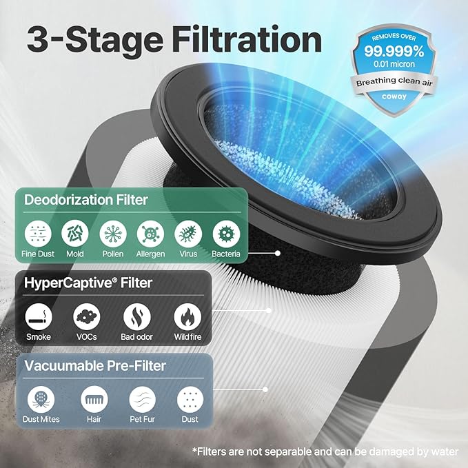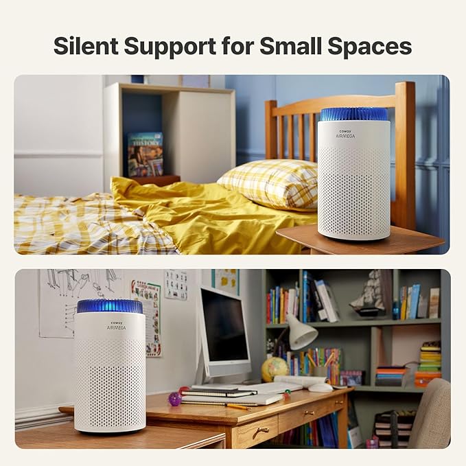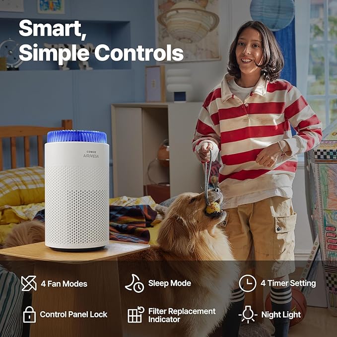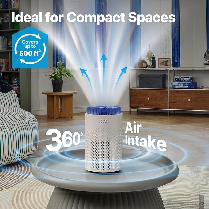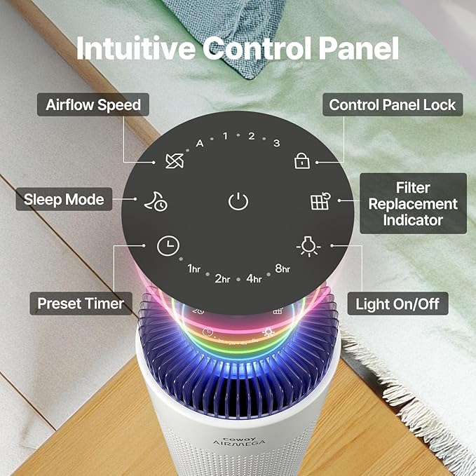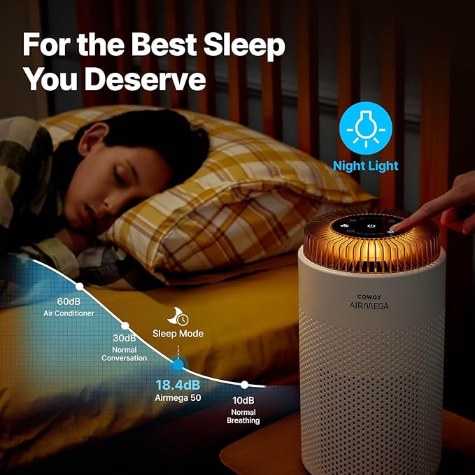 COWAY Air Purifiers for Bedroom Home up to 450 ft², HyperCaptive Filter for Smoke, Allergies, Pet Dander, AQI Monitor, Auto&Sleep Mode, Timer, Filter Indicator, Night Light, 3yr Warranty, 50 White