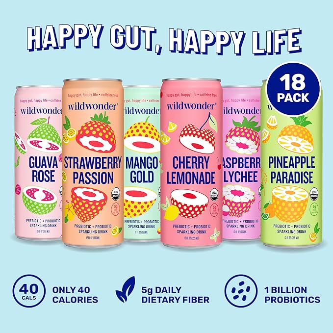 wildwonder Sparkling Probiotic Juice Drink 18pk, w/Gut Health & Immunity Support, 5g Prebiotic Fiber, Live Probiotics, Organic, Vegan, Low Sugar, Sampler Pack, 6 Flavors, Seen on Shark Tank