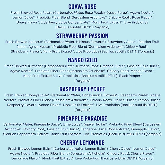- PROBIOTIC DRINK FOR GUT & IMMUNE HEALTH: 1 billion CFUs live vegan probiotics and 5g prebiotic plant fiber (food for your probiotics) in every can. Formulated with microbiome experts and made with real fruit and freshly brewed herbs.
