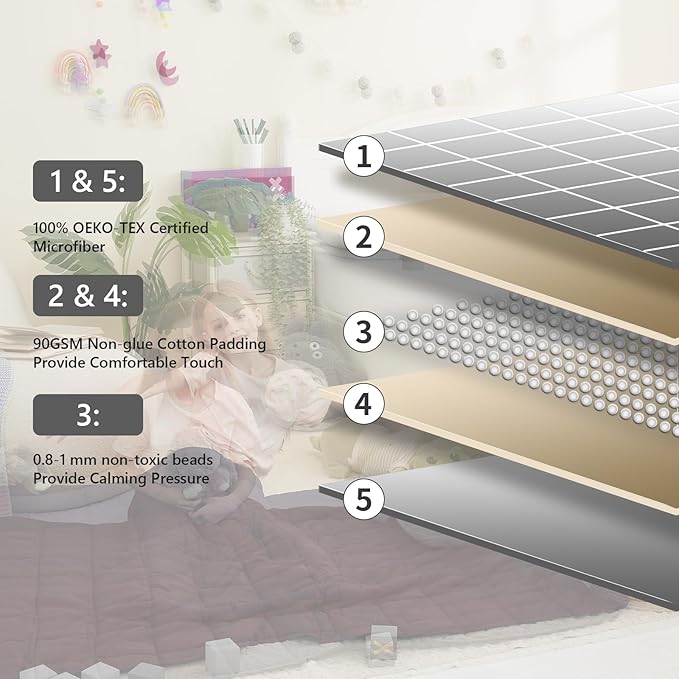- Premuim Material: The weighted blanket is made of soft breathable microfiber material and filled with 0.8-1 mm non-toxic hypo-allergenic glass beads. This blanket could providing a cooling sensation in the summer and a breathable warmth in the winter