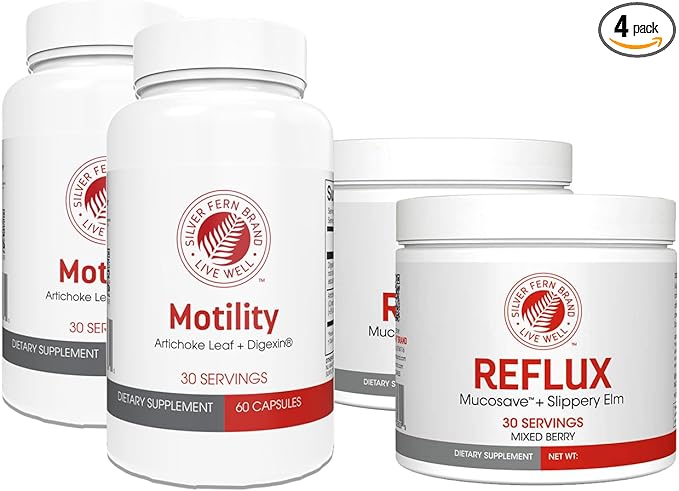 Silver Fern Brand Slow Motility+Kit β Digestive Support Bundle β 30-Day Supply β 2 Motility, 2 Berry Flavor Powder Reflux β Capsules, Powder β Artichoke Leaf, Okra, Ashwagandha, MucoSave β Made in USA