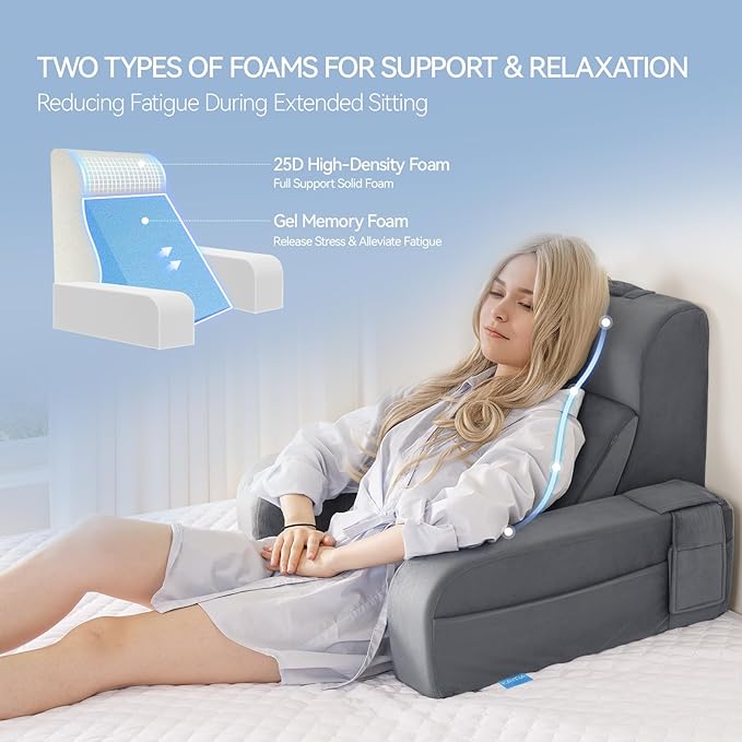 - 【Just Right Support & Comfort】The back pillow for bed sitting up expertly combines slightly firm high-density foam with soft memory foam to provide ample support for your back while ensuring comfort. Unlike typical shredded foam, both types of foam are solidly constructed, offering lasting support for those sitting on a bed or sofa without losing shape, alleviating discomfort and pressure in the shoulders, neck, and back. Achieve the perfect balance of softness and firmness at your fingertips!