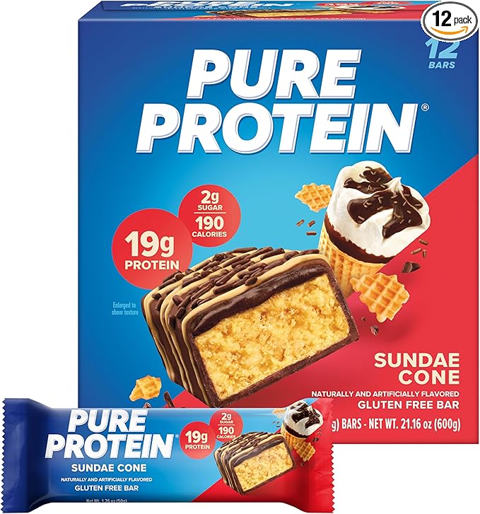 Pure Protein Bars, High Protein, Nutritious Snacks to Support Energy, Low Sugar, Gluten Free, Sundae Cone, 1.76oz, 12 Count (Packaging May Vary)