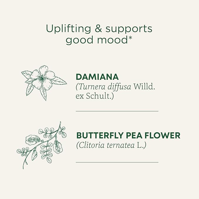 - Formula: With the uplifting herbal power of damiana and rose, and the unique addition of butterfly pea flower to inspire a sense of wonder, this tea supports a happy mood and an open heart*