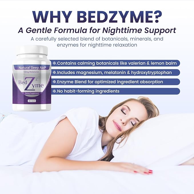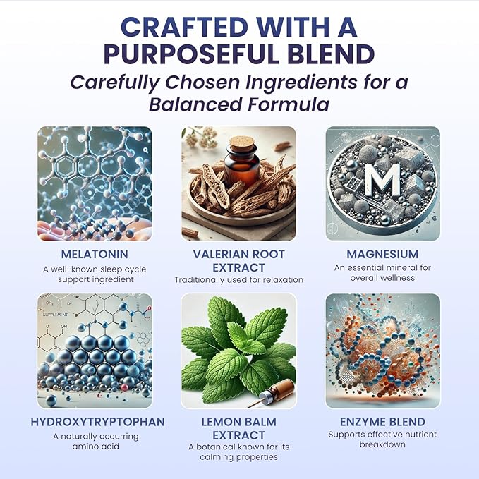 - Enzyme Sleep Delivery System: Our advanced Enzyme Sleep Delivery System is designed to enhance the absorption of key ingredients like magnesium, melatonin, and valerian root. This system helps with the effective delivery of nutrients, ensuring they are efficiently utilized by the body to assist in maintaining a calm sleep aid experience.