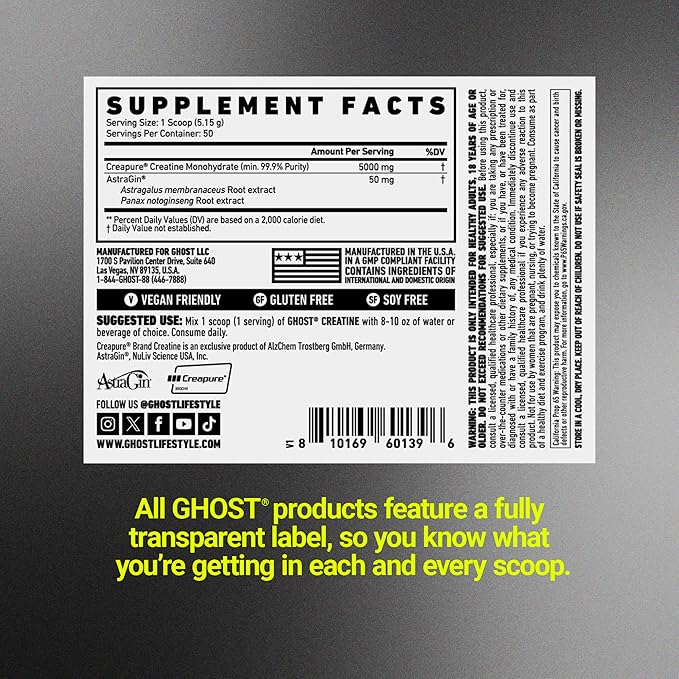 - Total Transparency: All GHOST products feature a transparent label that fully discloses the dose of each active ingredient. Zero proprietary blends means you know what you’re getting in each and every scoop. GHOST Basics Creatine is vegan friendly, gluten free, and soy free.