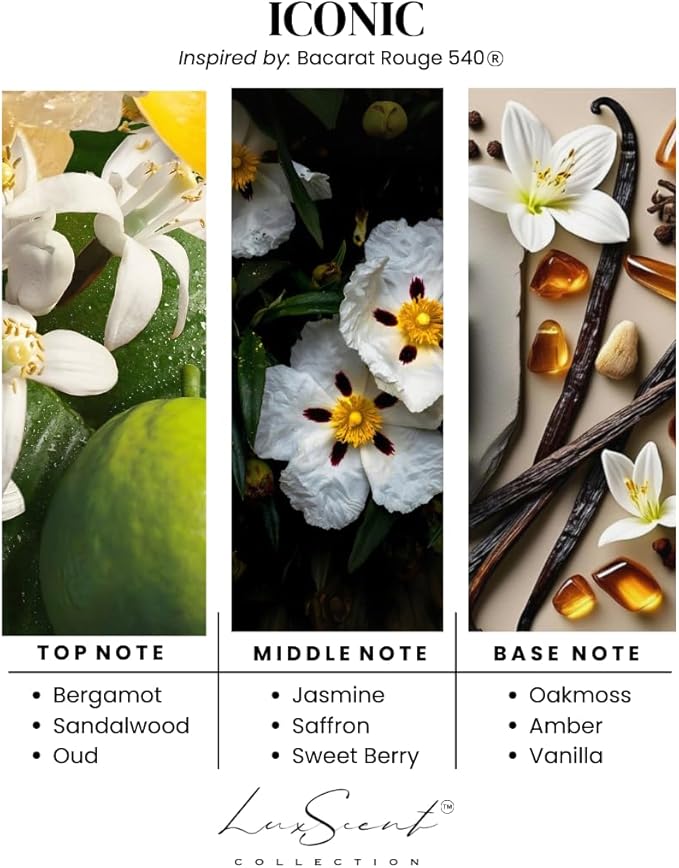 - ICONIC Baccarat Rouge Aroma Oil is a delicate and sophisticated blend reminiscent of an amber floral and woody breeze. Top notes of bergamot and crisp, sweet berry are complimented by a hint of jasmine and radiant of saffron. Mineral facets of ambergris and woody tones of a freshly cut oakmoss make this a scent fit for royalty.