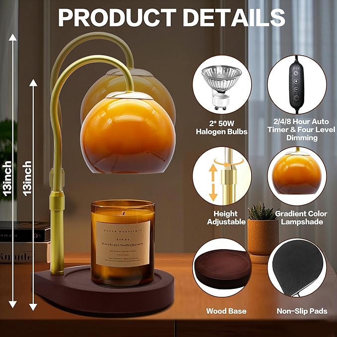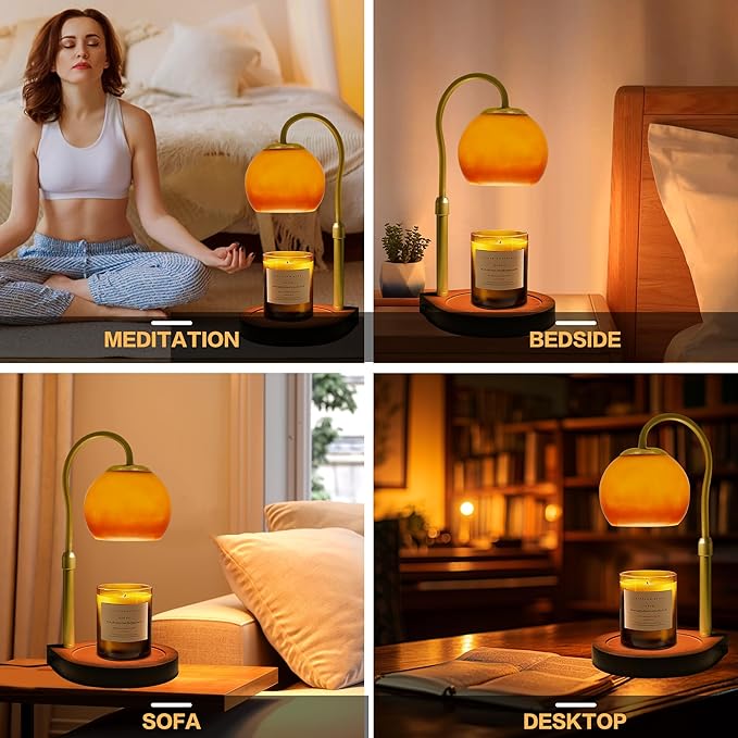 - Golden Glow & Timeless Warmth: The DALUXshop candle warmer lamp with timer captures the tranquil beauty of a sunset through its amber-tinted glass shade, casting a golden glow that elevates any room. Expertly designed by master artisans, this candle warmer lamp features a smooth, height-adjustable metal pole, a hand-blown lampshade with warm amber hues, and a base carved from natural Siberian wood with a refined grain. A perfect fusion of elegance and warmth, it turns every evening into a serene ritual.