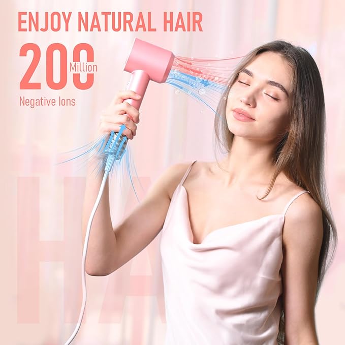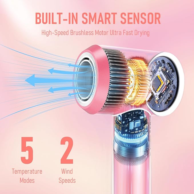 - 【Intelligent Temperature Control System】This hairdryer takes control with 5 temperature settings, 2 airflow speeds .It is equipped with an intelligent temperature control system,which can accurately control the airflow and prevent the risk of hair damage from high heat.